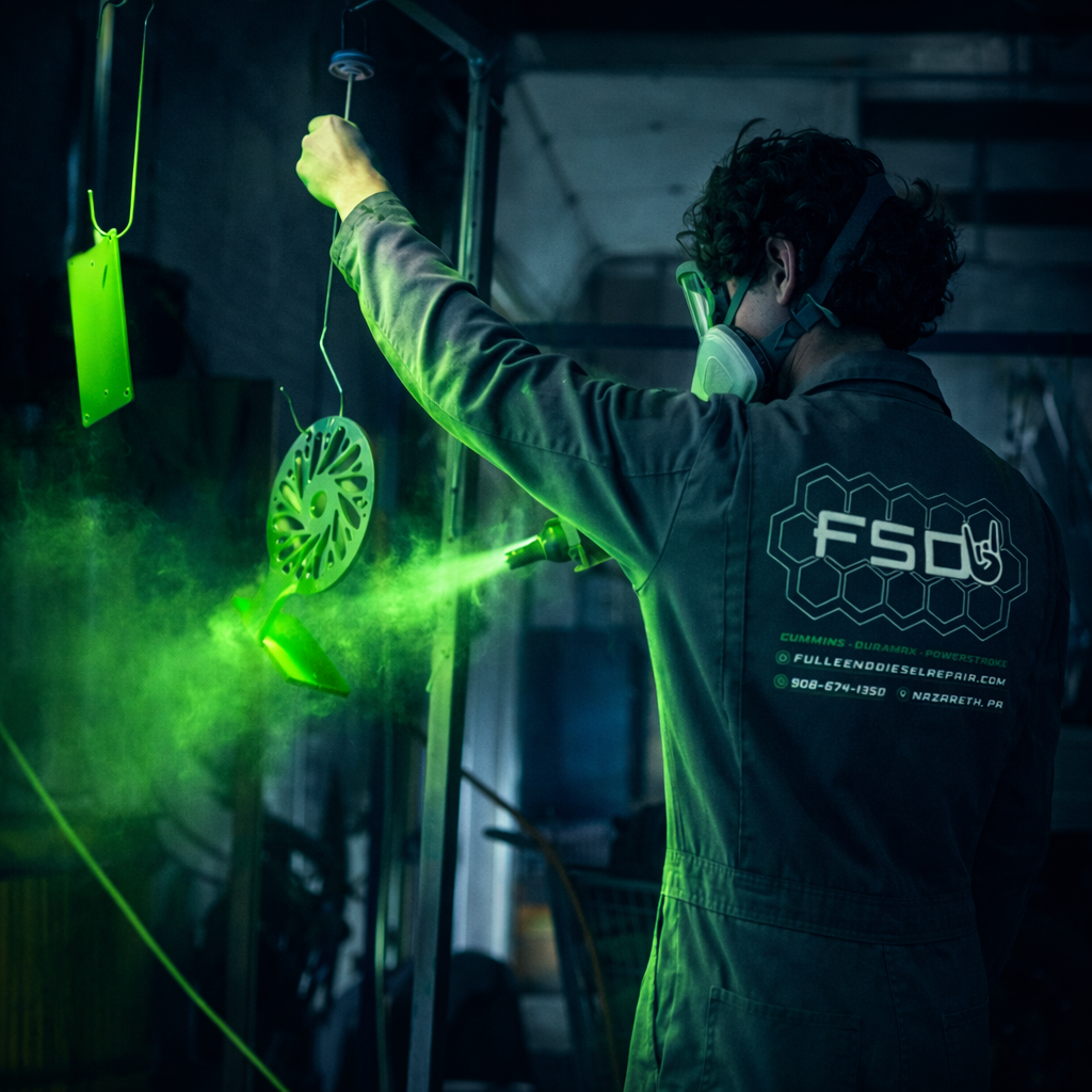 At Full Send Diesel, powder coating isn’t just an add-on, it’s a key part of building trucks that stand out. We handle everything in-house, from prepping and blasting to laying down durable, flawless finishes that last. Whether it’s suspension components, wheels, brackets, or custom parts, our powder coating process is designed to not only protect but also transform the look of your build.