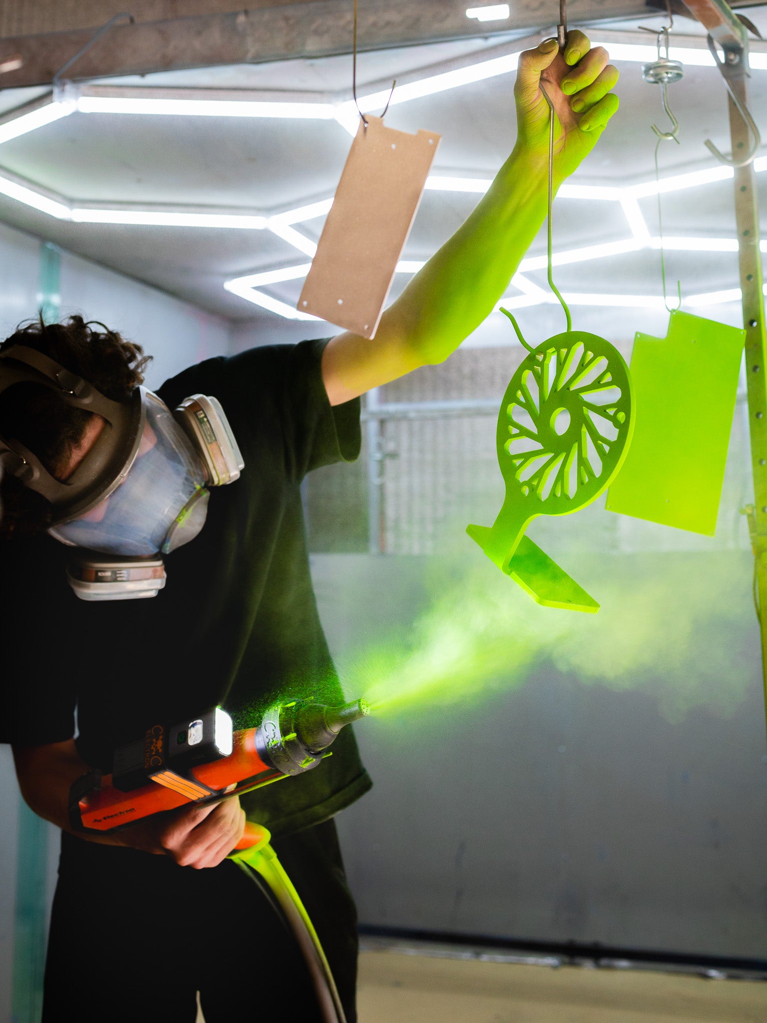 - Application: The selected powder is applied using an electrostatic spray gun. The particles are charged and adhere to the metal parts, creating an even and consistent coat.